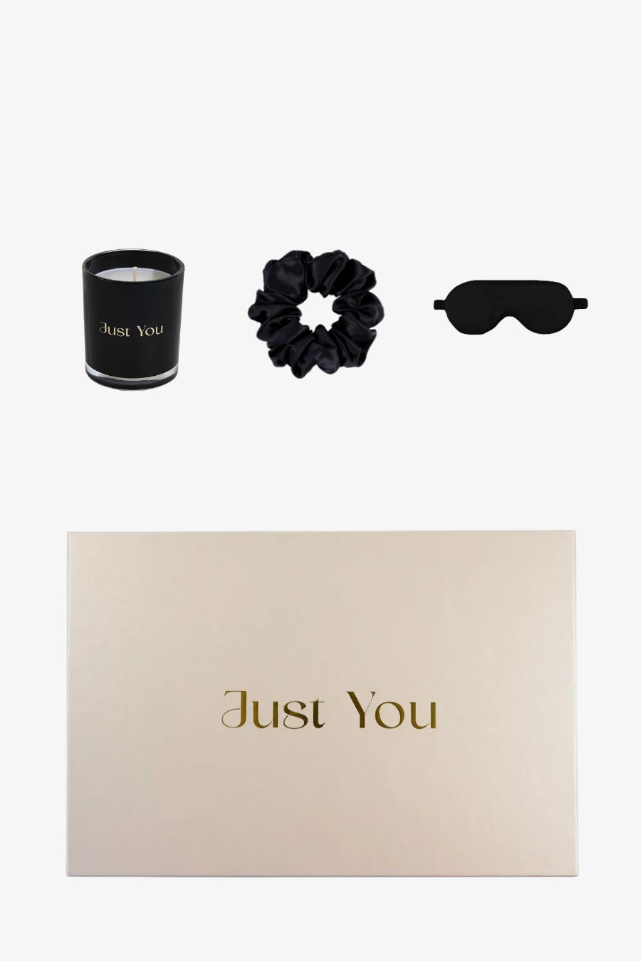 Zestaw Selfcare w kolorze czarnym – jedwabna opaska, gumka do włosów i świeca do masażu